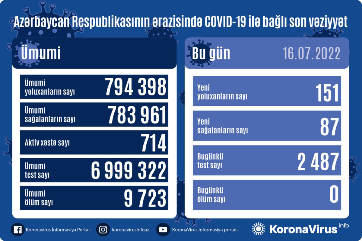 Azərbaycan Respublikasında koronavirus (COVID-19) infeksiyasına 151 yeni yoluxma faktı qeydə alınıb, 87 nəfər müalicə olunaraq sağalıb.