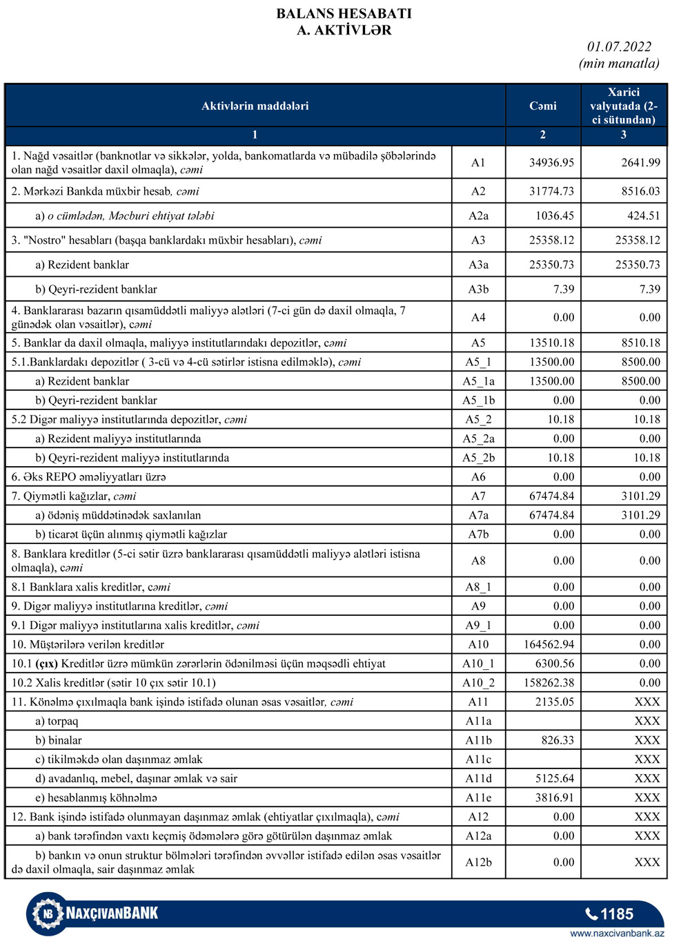 30 İyun 2022-ci il tarixində "Naxçıvanbank" 343 milyon 677 min manat cəmi aktivlərə, o cümlədən 164 milyon 563 min manat kredit portfelinə (müştərilərə verilmiş kreditlər) malik olub. Bank ötən ilin soununda 343 milyon 757 min manat cəmi aktivlərə, o cümlədən 140 milyon 901 min manat kredit portfelinə malik idi. Beləliklə, ötən ilin sonu ilə müqayisədə "Naxçıvanbank"ın kredit portfeli 23 milyon 662 min manat və ya 16,8% artıb.