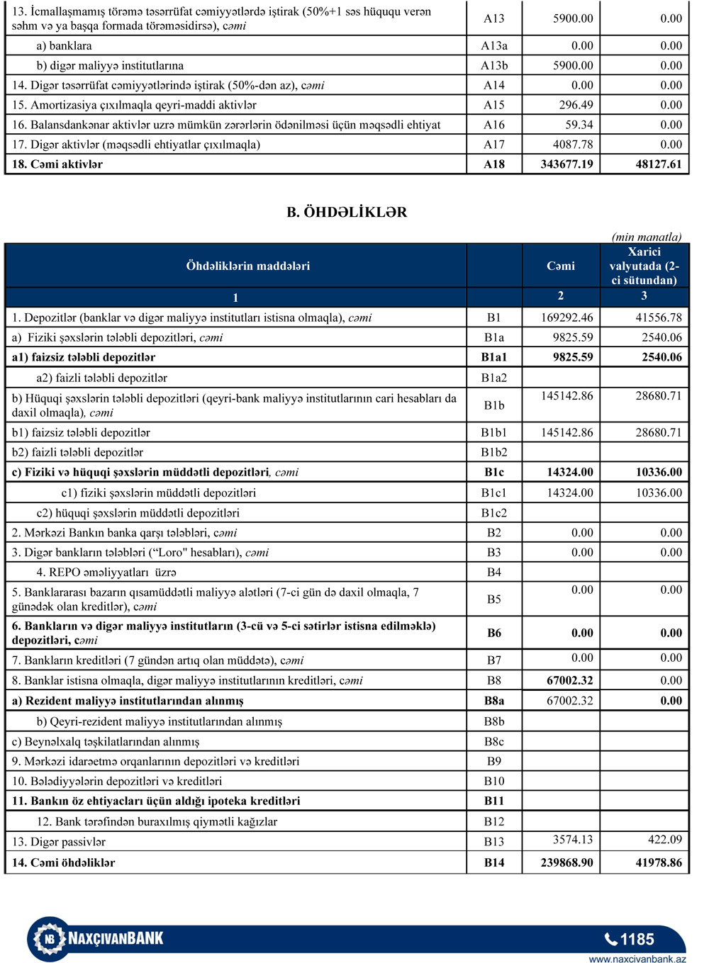 Qeyd edək ki, 2021-ci ilin birinci yarısında "Naxçıvanbank"ın cəmi əməliyyat gəlirləri 8 milyon 585 min manat, cəmi əməliyyat xərcləri 3 milyon 71 min manat, gəlirlər xərcləri üstələdiyindən əməliyyat mənfəəti 5 milyon 514 min manat təşkil etmişdi. Bank əməliyyat mənfəətindən aktivlər üzrə mümkün zərərlərin ödənilməsi üçün xüsusi ehtiyatın yaradılmasına 869 min manat ayırmış, 960 min manat mənfəət vergisi ödəmiş və həmin dövrü 3 milyon 684 min manat xalis mənfəət ilə bağlamışdı.