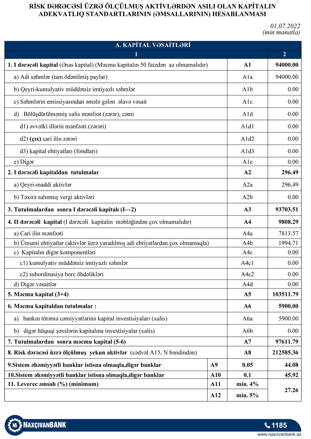 30 İyun 2022-ci il tarixində "Naxçıvanbank" ASC 97 milyon 612 min manat məcmu kapitala malik olub. Bank ötən ilin sonunda 91 milyon 683 min manat məcmu kapitala malik idi.