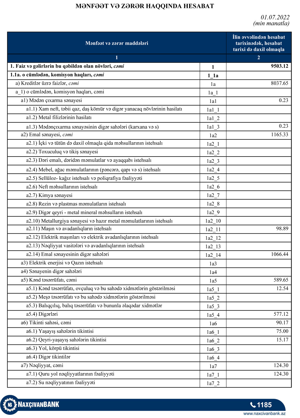 2022-ci ilin birinci yarısında "Naxçıvanbank"ın cəmi əməliyyat gəlirləri (faiz və qeyri-faiz gəlirləri) 12 milyon 510 min manat, cəmi əməliyyat xərcləri (faiz və qeyri faiz xərcləri) 4 milyon 336 min manat, gəlirlər xərcləri üstələdiyindən əməliyyat mənfəəti 8 milyon 174 min manat təşkil edib. Bank aktivlər üzrə mümkün zərərlərin ödənilməsi üçün xüsusi ehtiyatın yaradılmasına 361 min manat ayırdığından cari ilin ilk 6 ayını 7 milyon 814 min manat xalis mənfəət ilə başa vurub.