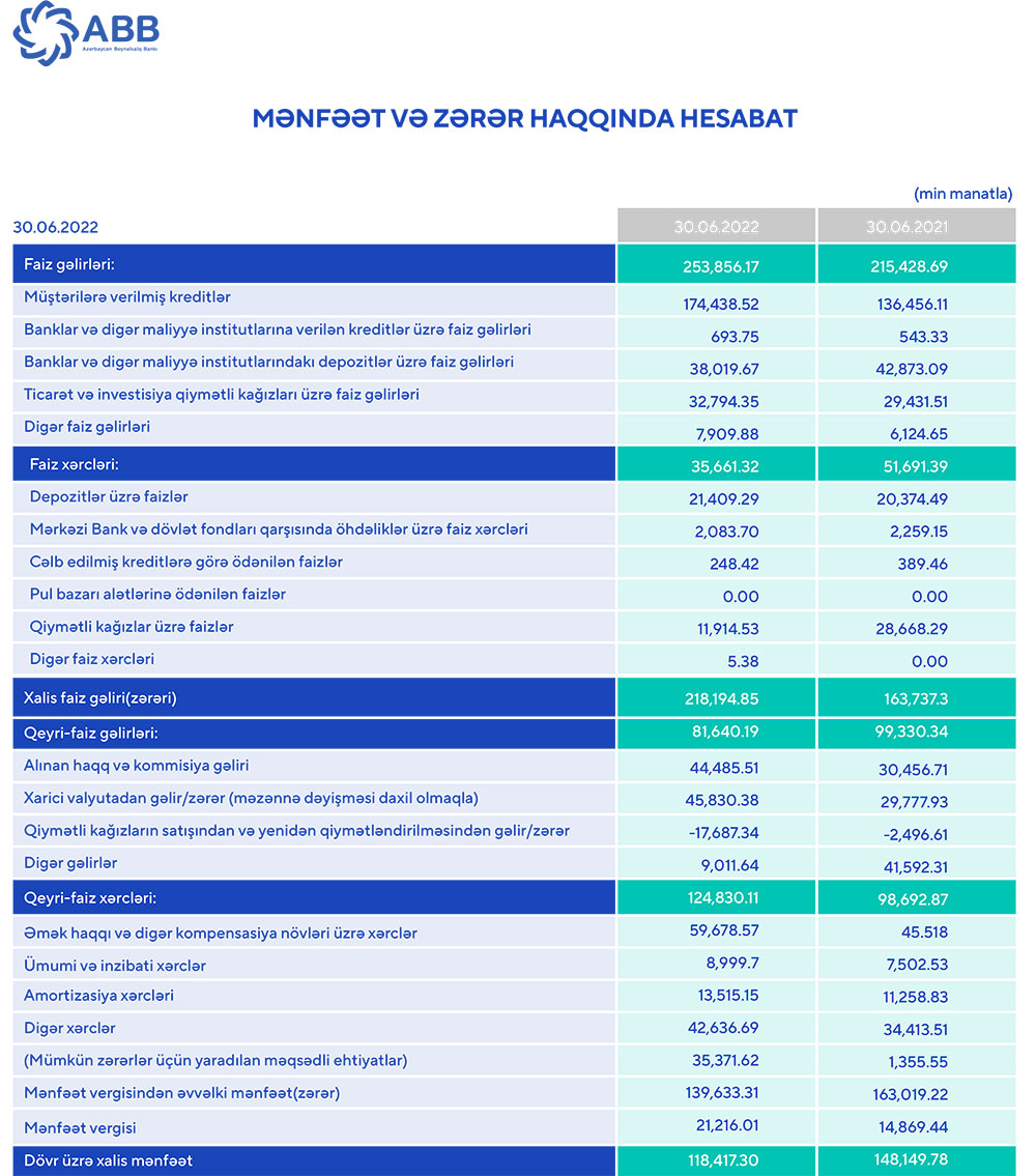 2022-ci ilin yanvar-iyun dövründə “ABB” ASC-nin cəmi əməliyyat gəlirləri (faiz və qeyri-faiz gəlirləri) 335 milyon 496 min manat, cəmi əməliyyat xərcləri (faiz və qeyri-faiz xərcləri) 160 milyon 491 min manat, gəlirlər xərcləri üstələdiyindən əməliyyat mənfəəti 175 milyon 5 min manat təşkil edib. Bank əməliyyat mənfəətindən mümkün zərərlər üçün yaradılan məqsədli ehtiyatlara 35 milyon 372 min manat ayırıb və 21 milyon 216 min manat mənfəət vergisi hesablanıb.