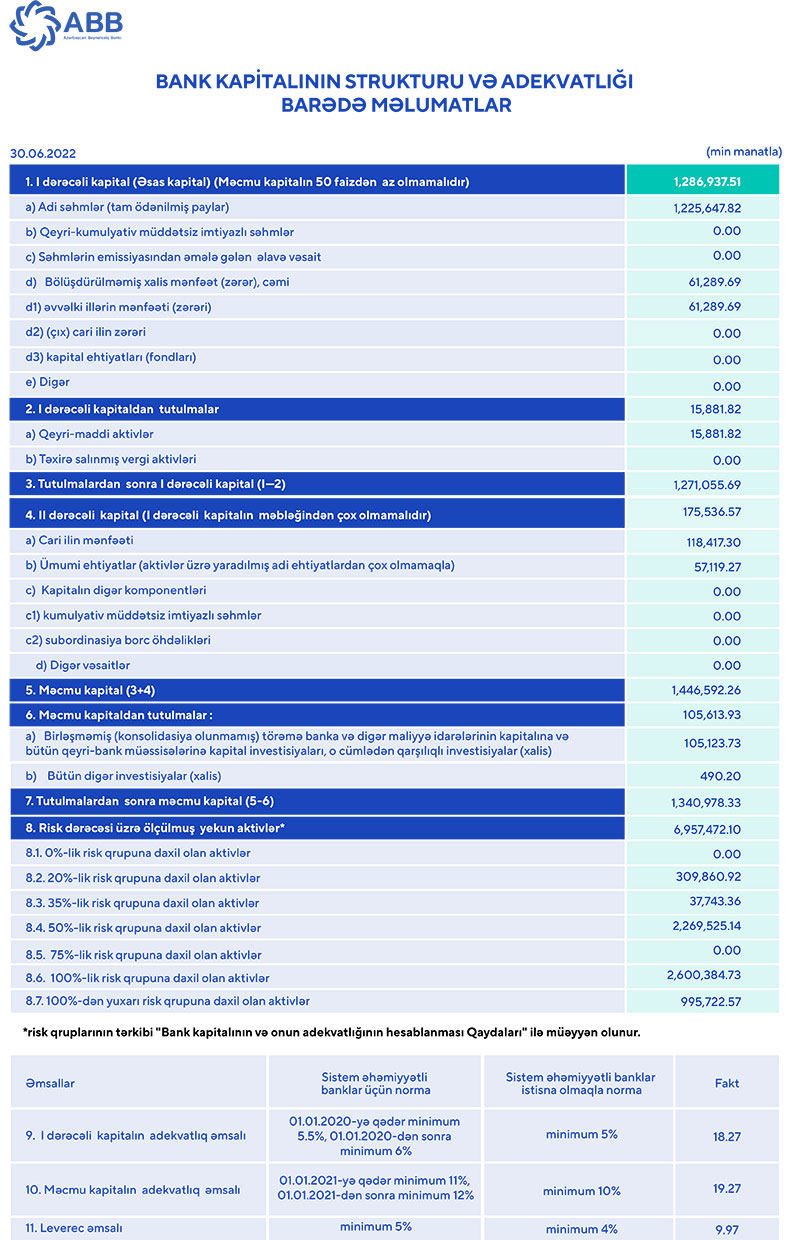30 iyun 2022-ci il tarixində “ABB” ASC 1 milyard 340 milyon 978 min manat məcmu kapitala malik olub. Bankın 1-ci dərəcəli kapitalının adekvatlıq əmsalı 18,28%, məcmu kapitalının adekvatlıq əmsalı 19,27% təşkil edib.