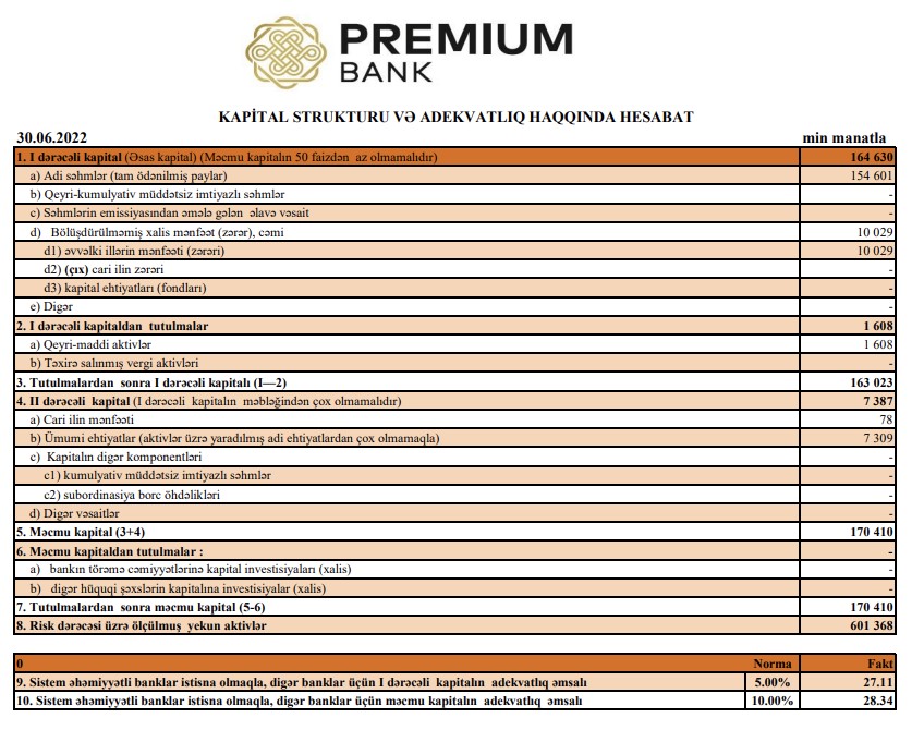 30 İyun 2022-ci il tarixində "Premium Bank" ASC 170 milyon 410 min manat məcmu kapitala malik olub.