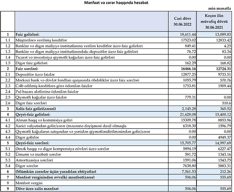 Müqayisə üçün qeyd edək ki, 2021-ci ilin yanvar-iyun dövründə “Muğanbank” ASC-nin cəmi əməliyyat gəlirləri 28 milyon 490 min manat, cəmi əməliyyat xərcləri 27 milyon 722 min manat, əməliyyat mənfəəti 768 min manat, mümkün zərərlər üçün yaradılan ehtiyatlara ayrılan məbləğ 212 min manat, xalis mənfəəti 556 min manat təşkil etmişdi.