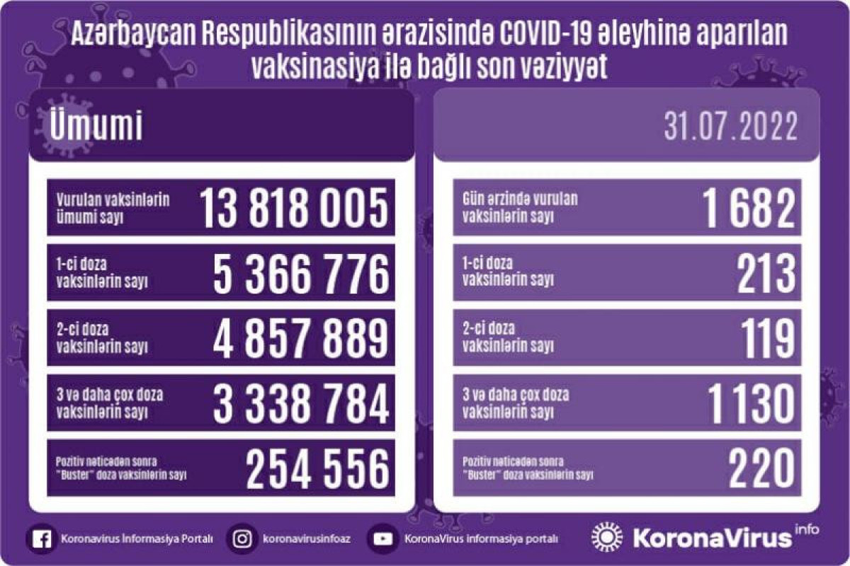 Azərbaycanda son sutkada koronavirus (COVID-19) əleyhinə 1 682 vaksin vurulub. Bir gündə birinci mərhələ üzrə vaksinasiya olunanların sayı 213, ikinci mərhələ üzrə vaksinasiya olunanların sayı 119, üç və daha çox doza üzrə vaksinasiya olunanların sayı 1130, pozitiv nəticədən sonra buster doza üzrə vaksinasiya olunanların sayı 220 nəfərdir.