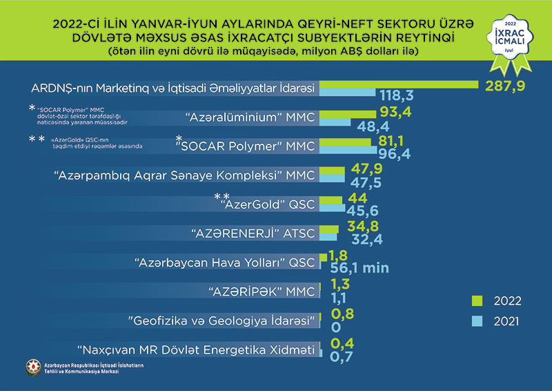 “İxrac İcmalı” tərəfindən qeyri-neft sektoru üzrə 2022-ci ilin yanvar-iyun aylarında həyata keçirilən ixracla bağlı həm qeyri-dövlət, həm də dövlətə məxsus ixracatçı subyektlərin reytinqi tərtib edilib.