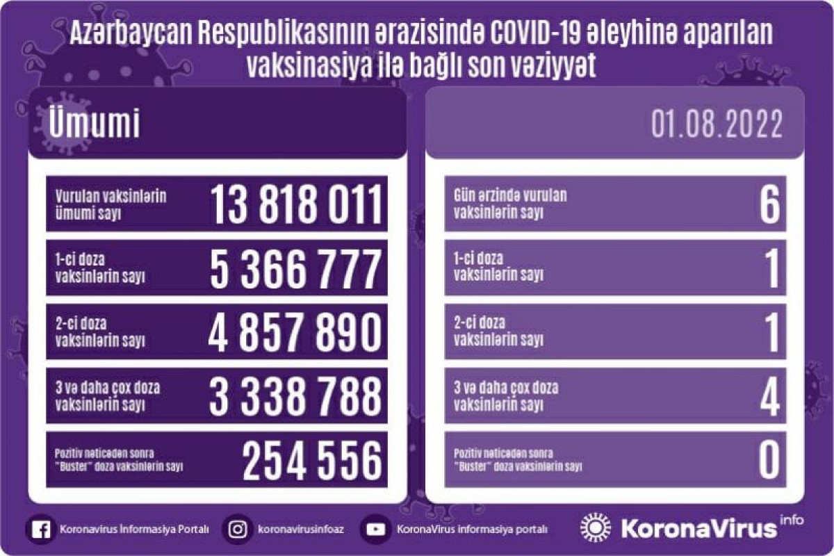 Azərbaycanda son sutkada koronavirus (COVID-19) əleyhinə 6 vaksin vurulub. Bir gündə birinci mərhələ üzrə vaksinasiya olunanların sayı 1, ikinci mərhələ üzrə vaksinasiya olunanların sayı 1, üç və daha çox doza üzrə vaksinasiya olunanların sayı isə 4 olub. Son sutkada pozitiv nəticədən sonra buster doza üzrə vaksinasiya olunanlar olmayıb.