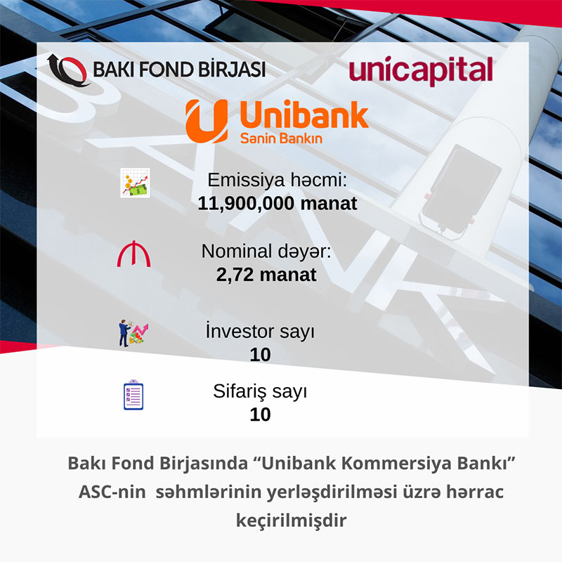 Xəbər verdiyimiz kimi, 21 iyul 2022-ci il tarixində Bakı Fond Birjasının (BFB) Listinq Komitəsinin qərarı ilə “Unibank Kommersiya Bankı” ASC-nin ümumi dəyəri 11 milyon 900 min manat olan səhmləri standart bazar seqmentində listinqə daxil edilib. Adi adlı sənədsiz səhmlərin sayı 4,375,000 ədəd, hər birinin nominal dəyəri 2.72 manatdır.