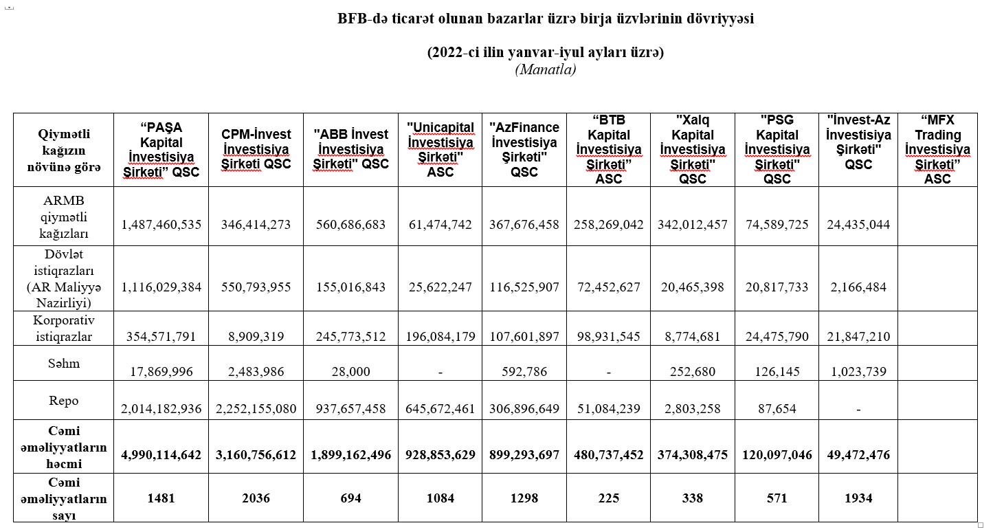 2022-ci ilin yanvar-iyul ayları üzrə Bakı Fond Birjasında ticarət olunan bazarlar üzrə birja üzvlərinin dövriyyəsi açıqlanıb.