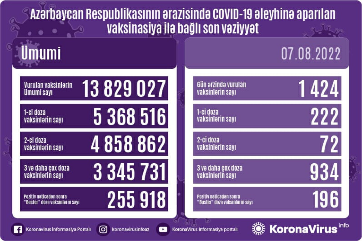 Azərbaycanda son sutkada koronavirus (COVID-19) əleyhinə 1 424 vaksin vurulub. Bir gündə birinci mərhələ üzrə vaksinasiya olunanların sayı 222, ikinci mərhələ üzrə vaksinasiya olunanların sayı 72, 3-cü və daha çox doza üzrə vaksinasiya olunanların sayı 934, pozitiv nəticədən sonra buster doza olunanların sayı isə 196 nəfərdir.