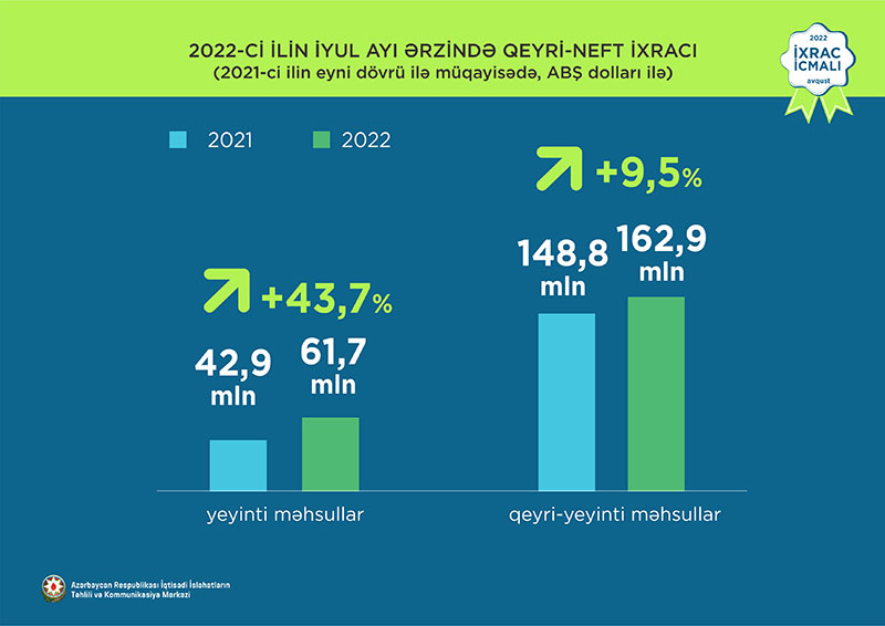 2022-ci ilin iyul ayı üzrə ixrac 4,1 milyard ABŞ dolları təşkil edib. Qeyri-neft sektoru üzrə ixracda artım 17,2% təşkil etməklə 224,6 milyon ABŞ dolları olub. 2022-ci ilin iyun ayı ərzində yeyinti məhsulları üzrə ixrac 43,7% artaraq 61,7 milyon ABŞ dolları, qeyri-yeyinti məhsulları üzrə isə 9,5% artaraq 162,9 milyon ABŞ dolları təşkil edib.
