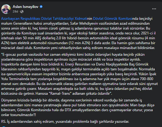 "Azərbaycan Respublikası Dövlət Təhlükəsizliyi Xidmətinin Dövlət Gömrük Komitəsində keçirdiyi məlum generalların həbsi əməliyyatlardan, Səfər Mehdiyevin vəzifəsindən azad edilməsindən sonra əmin idim ki, heç kimin cürəti çatmaz iş adamlarına qanunsuz tələblər irəli sürsünlər. Bu günlərdə də Komitəyə sual ünvanladım ki, əgər ekoloji faktor əsasdırsa, onda necə olur, 2021-ci il istehsalı olan 50 min ABŞ dollarlıq 2.0 litr hibrid-benzin avtomobilin idxal gömrük rüsumu (4 min AZN) tam elektrik avtomobil rüsumundan (12 min AZN) 3 dəfə azdır. Elə həmin gün səhifəmə bir müraciət daxil olub. Komitənin yeni rəhbərliyindən xahiş edirəm məsələyə münasibət bildirsinlər.