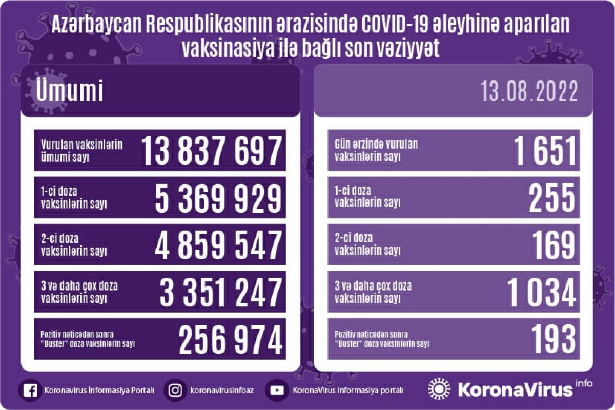 Azərbaycanda son sutkada koronavirus (COVID-19) əleyhinə 1651 vaksin vurulub. Bir gündə birinci mərhələ üzrə vaksinasiya olunanların sayı 255, ikinci mərhələ üzrə vaksinasiya olunanların sayı 169, üç və daha çox doza vaksin vurduranların sayı 1034, pozitiv nəticədən sonra buster doza üzrə vaksinasiya olunanların sayı isə 193 nəfərdir.