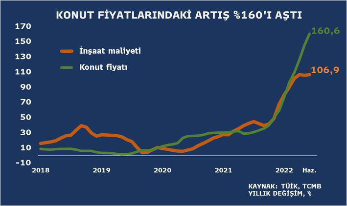 İyun ayında yeni evlərin qiymətləri illik müqayisədə 164,8 faiz, köhnə evlərin qiymətləri isə 160,7 faiz artıb. İyun ayında Türkiyədə evin bir kvadrat metrinin orta qiyməti 13 min TL-ni (türk lirəsini) keçib.