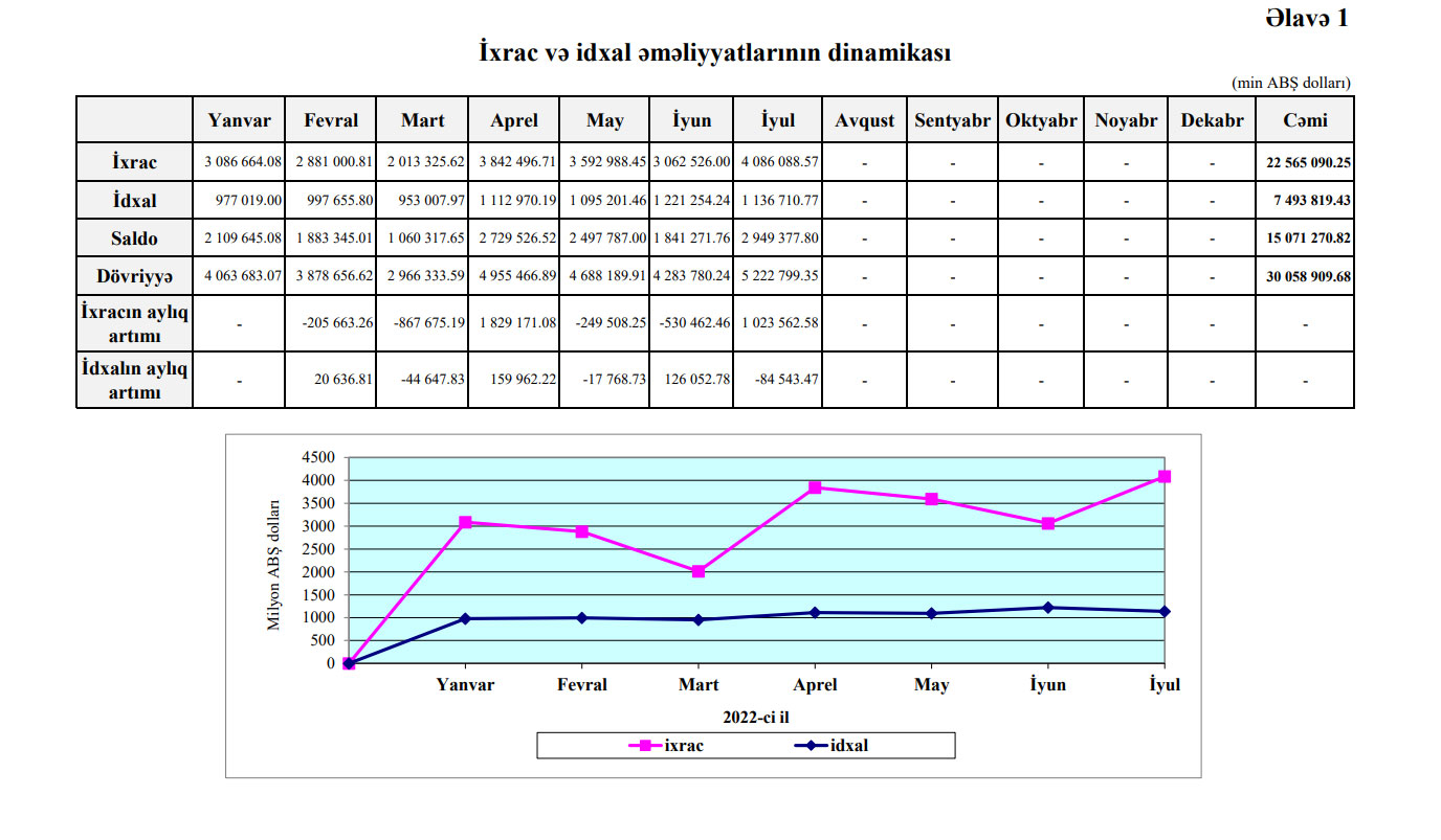 2022-ci ilin yanvar - iyul dövründə Azərbaycanın xarici ticarət əməliyyatlarının həcmi30 milyard 58 milyon 909 min ABŞ dolları, o cümlədən ixrac əməliyyatları 22 milyard 565 milyon 90 min ABŞ dolları, idxal əməliyyatları 7 milyard 493 milyon 819 min ABŞ dolları, saldo müsbət 15 milyard 71 milyon 270 min ABŞ dolları təşkil edib.