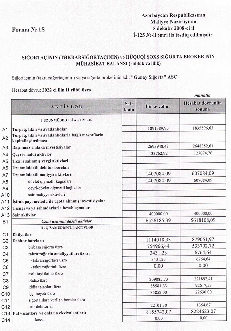 “Günay Sığorta”nın cəmi aktivləri ötən ilin sonunda 16 milyon 354 min manat ikən, 30 İyun 2022-ci il tarixində 15 milyon 53 min manat təşkil edib (1 milyon 301 min manat və ya 8% azalıb).