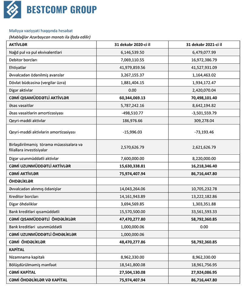 2021-ci ildə “Bestcomp Group”un cəmi gəlirləri 118 milyon 983 min 691 manat, cəmi xərcləri 109 milyon 973 min 260 manat təşkil edib. 2020-ci ildə şirkətin cəmi gəlirləri 124 milyon 805 min 31 manat, cəmi xərcləri 115 milyon 100 min 674 manat təşkil etmişdi.