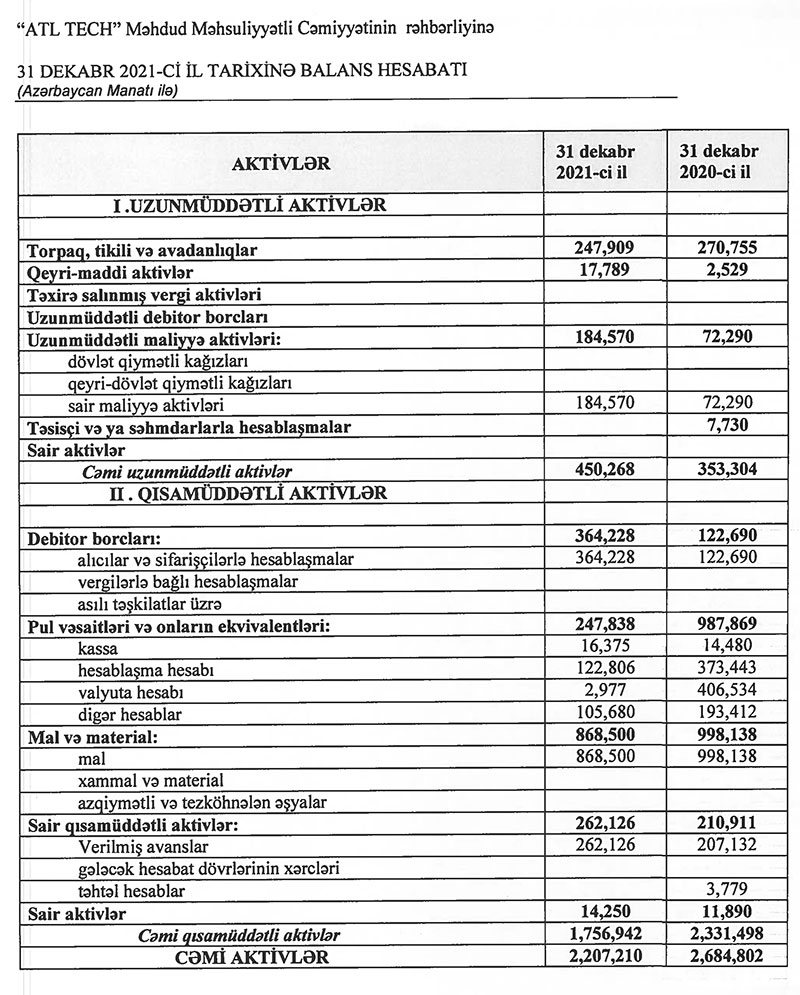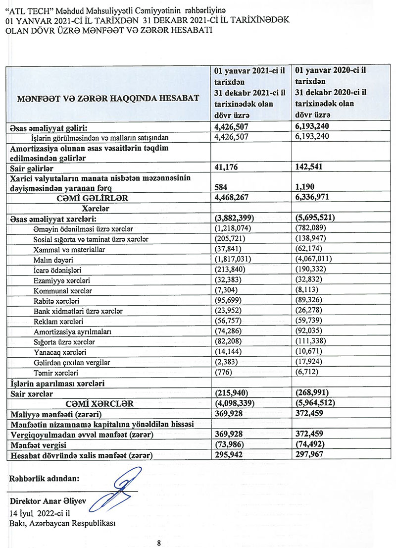 Marja.az xəbər verir ki, "ATL Tech" şirkətinin satışdan gəlirləri 2020-ci ildə 6 milyon 193 min manat ikən, 2021-ci ildə 4 milyon 426 min manata düşüb (28,5% azalma).