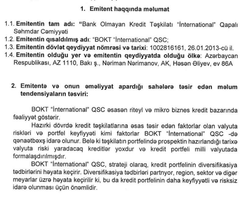 BOKT "İnternational" QSC istiqraz emissiyası ilə 2 milyon manat cəlb etməyi planlaşdırır.