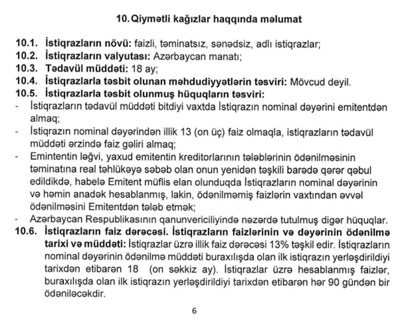 Marja.az xəbər verir ki, faizli, təminatsız, sənədsiz, adlı istiqrazların hər birinin nominal dəyəri 100 manat, sayı 20 000 ədəddir. İstiqrazlar üzrə illik faiz dərəcəsi 13%, tədavül müddəti 18 aydır.