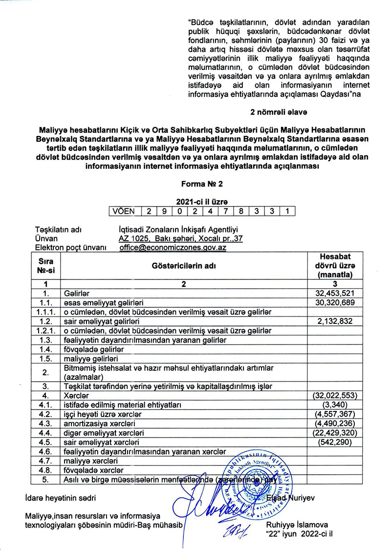 Ötən ili İqtisadi Zonaların İnkişafı Agentliyinin əsas əməliyyat gəlirləri 30 milyon 320 min 89 manat, sair əməliyyat gəlirləri 2 milyon 132 min 832 manat təşkil edib.
