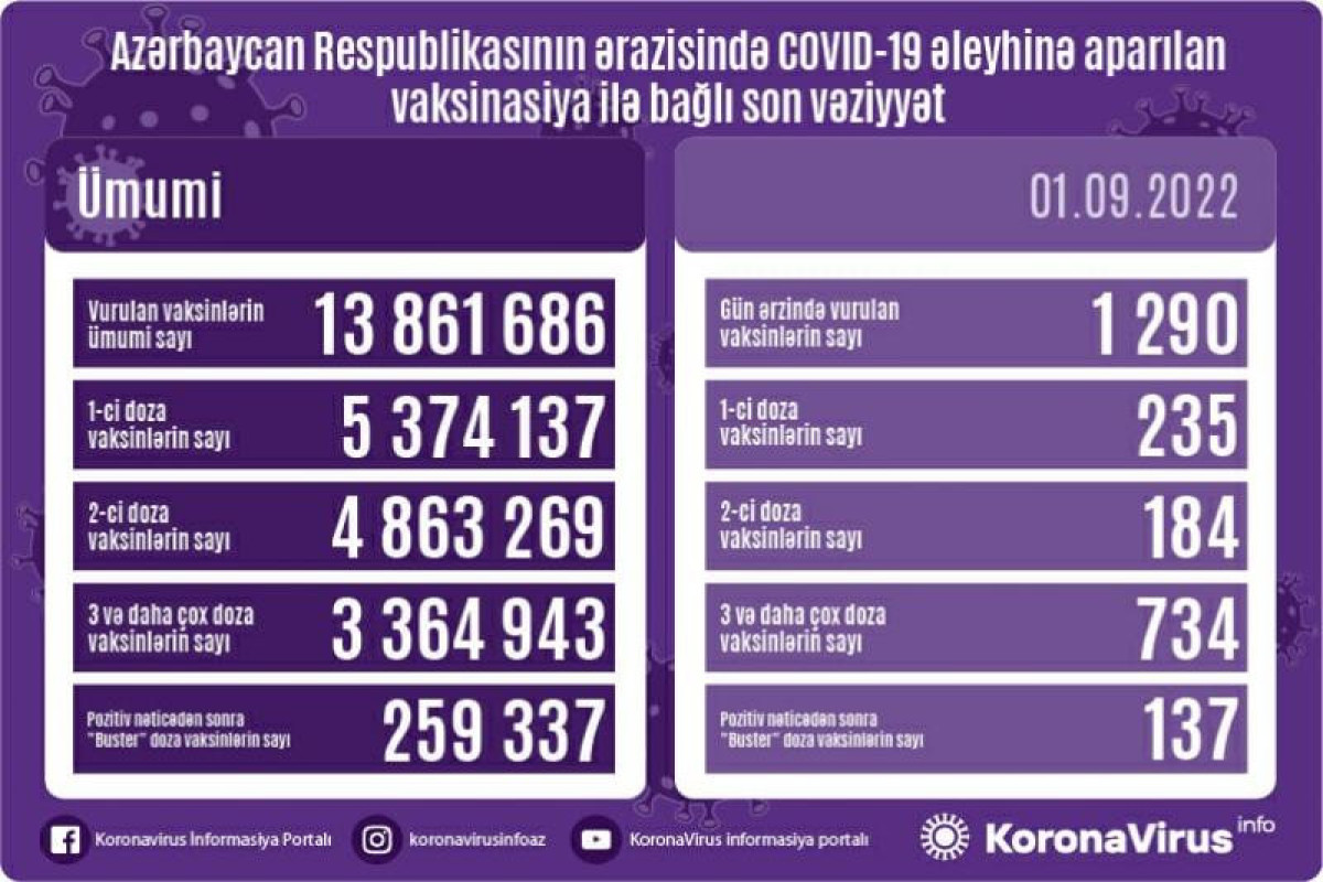 Azərbaycanda son sutkada koronavirus (COVID-19) əleyhinə 1290 vaksin vurulub. Bir gündə birinci mərhələ üzrə vaksinasiya olunanların sayı 235, ikinci mərhələ üzrə vaksinasiya olunanların sayı 184, üç və daha çox doza üzrə vaksinasiya olunanların sayı 737, pozitiv nəticədən sonra buster doza üzrə vaksinasiya olunanların sayı 137 nəfərdir.