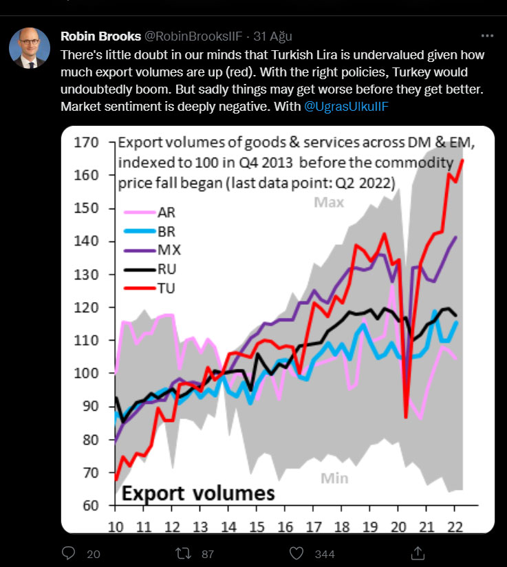 Beynəlxalq Maliyyə İnstitutunun (IIF) baş iqtisadçısı Robin Brooks Türkiyənin ikinci rübdə 7,6% artdığı açıqlandıqdan sonra Türkiyəiqtisadiyyatını şərh edib.
