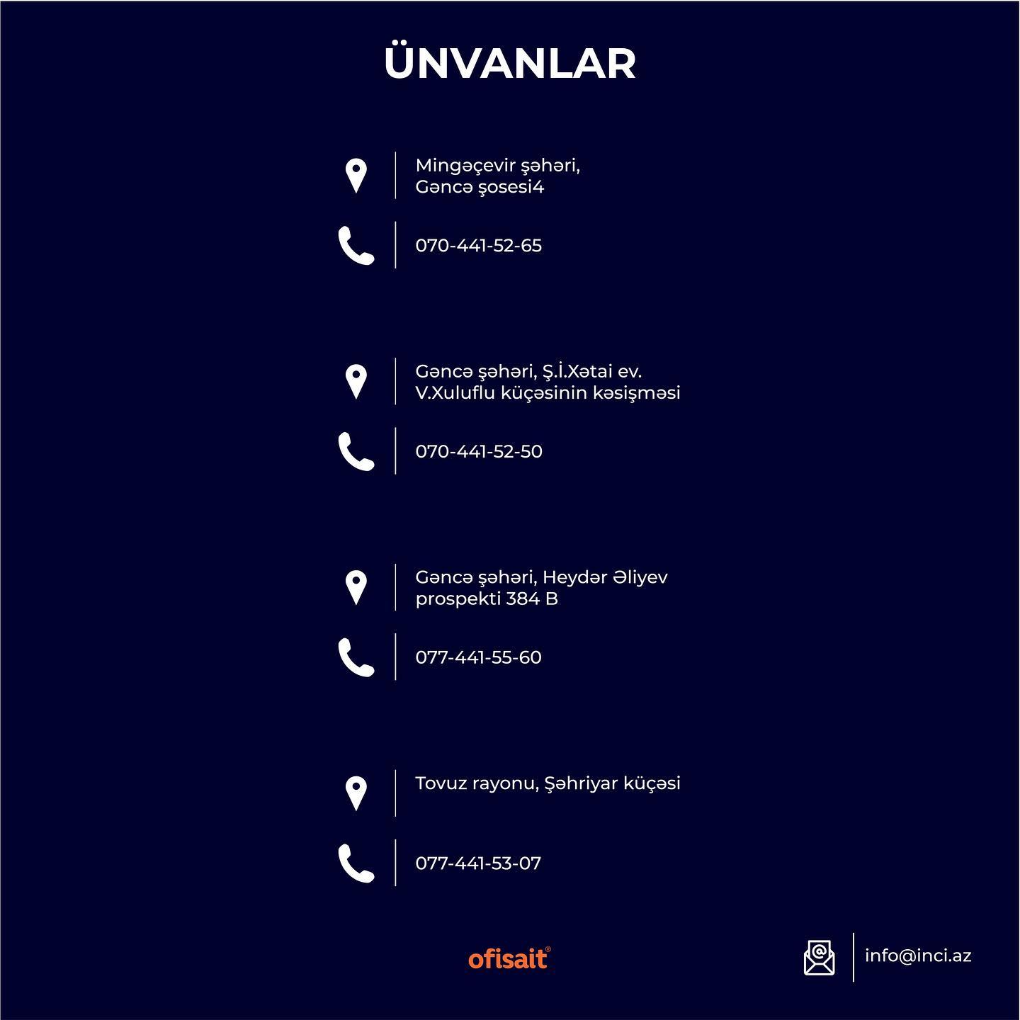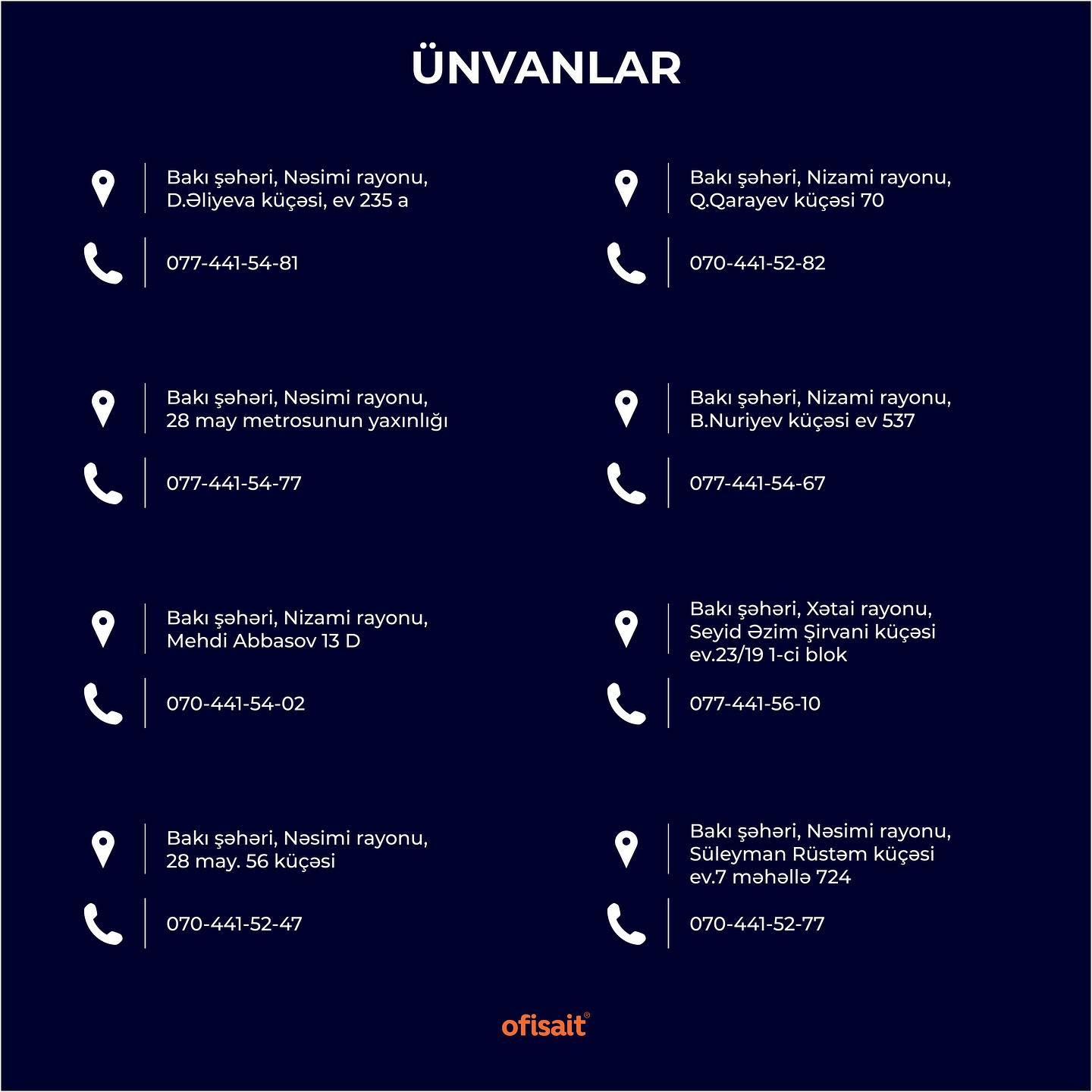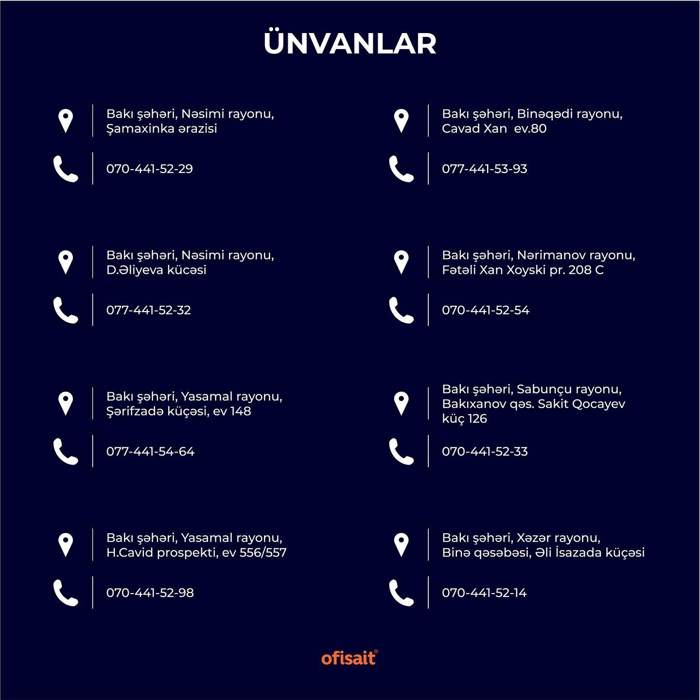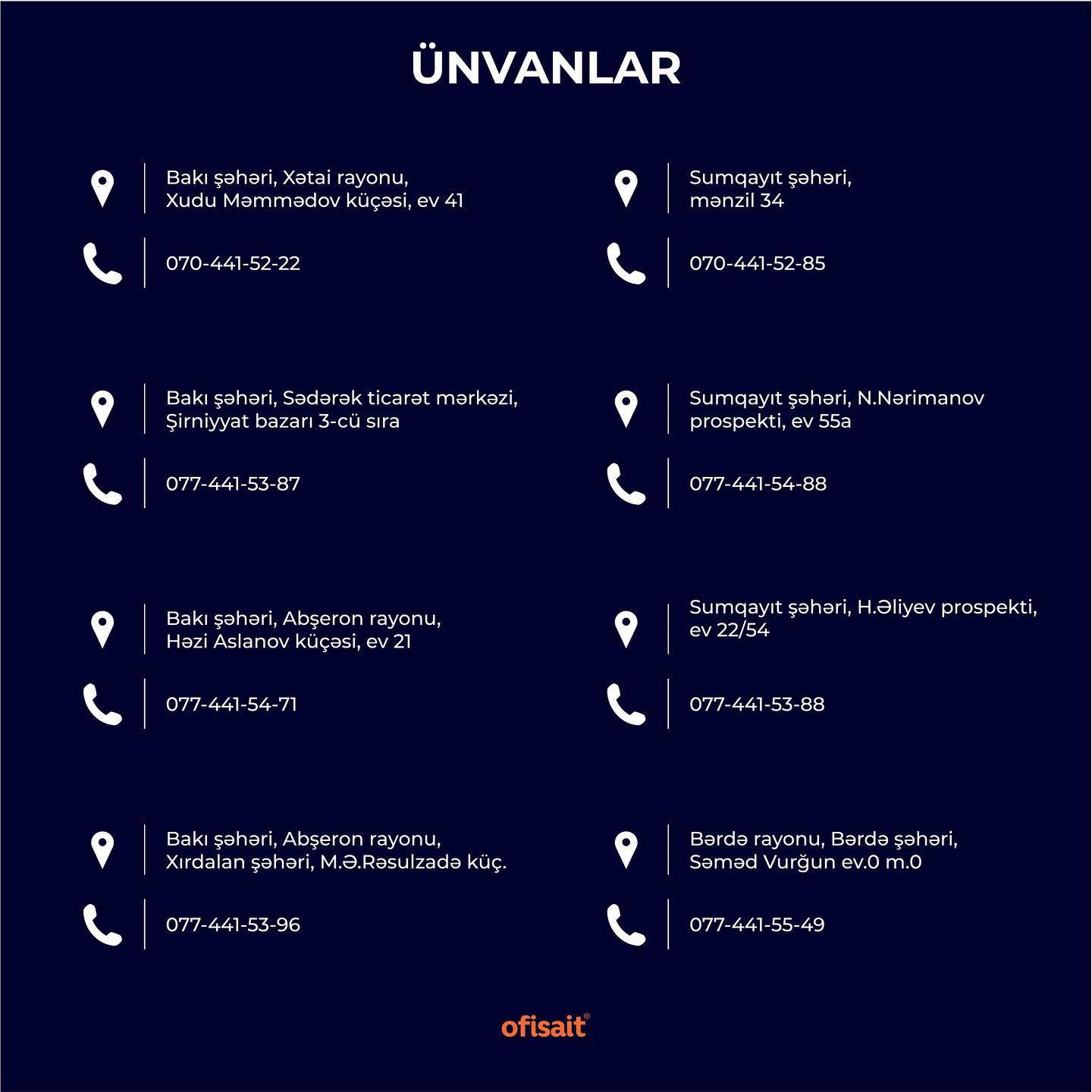 (®) Məktəb və ofis ləvazimatlarının topdan qiymətlərə pərakəndə satışı ilə də məşğul olan Ofisait mağazalar şəbəkəsinin ünvanlarını təqdim edirik.