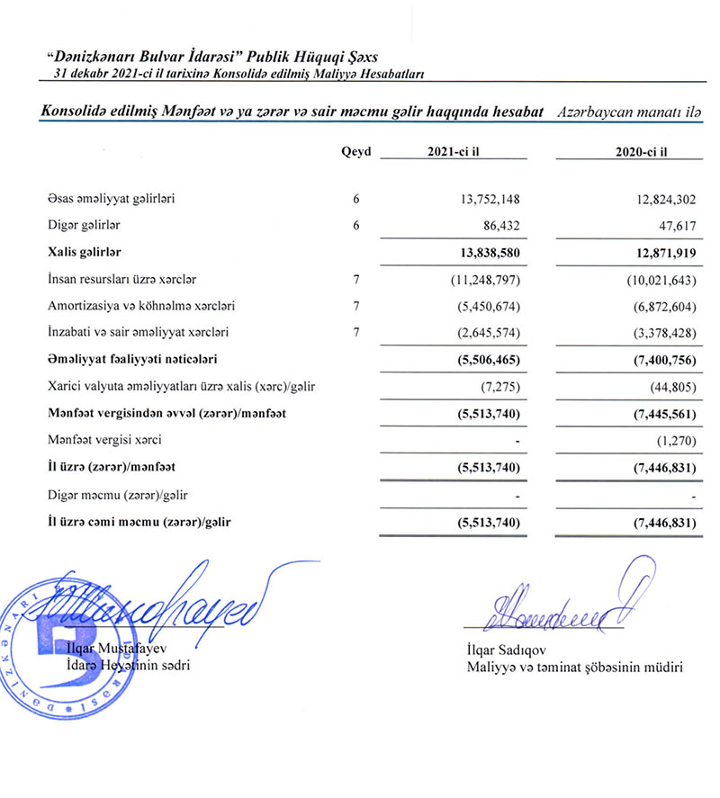 Dənizkənarı Bulvar İdarəsi (DBİ) 2021-ci ili 5 milyon 514 min manat xalis zərərlə başa vurub. Qurum 2020-ci ildən 7 milyon 447 min manat xalis zərərlə çıxmışdı.