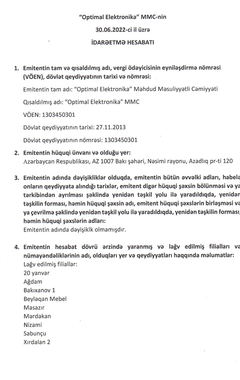"Optimal Elektronika" MMC 2022-ci ilin birinci yarısını (yanvar-iyun) 776 min manat xalis mənfəət ilə başa vurub. Xatırladaq ki, Şirkət 2021-ci ili 1 milyon 934 min manat xalis mənfəət ilə bağlamışdı.