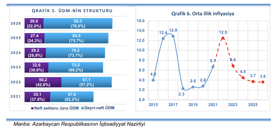 İqtisadiyyatın diversifikasiyasının genişləndirilməsi növbəti illərdə də əsas strateji prioritetlərdən biri olmağa davam edəcəkdir. İqtisadi artımın əsas hərəkətverici qüvvəsinin neft sektorundan qeyri-neft sektoruna transformasiya olunması sayəsində dövlət büdcəsində qeyri-neft gəlirlərinin payının davamlı artımına nail olunacağı gözlənilir. 2026-cı ildə ÜDM-nin tərkibində qeyri-neft sektorunun payının 78,0 faizə, neft sektorunun payının isə 22,0 faizə bərabər olacağı proqnozlaşdırılır (qrafik 5). Baza ssenaridə 2022-ci ildə 12,5 faiz, 2023-cü ildə isə 6,9 faiz proqnozlaşdırılan orta illik inflyasiyanın azalan templə 2026- cı ildə 3,6 faizə qədər enəcəyi gözlənilir.