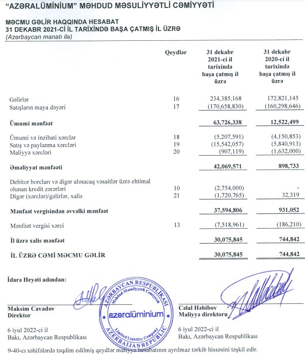 Azərbaycanın əlvan metallurgiya sənayesinin aparıcı şirkəti, həmçinin Cənubi Qafqazda yeganə ilkin alüminium istehsalçısı 30 milyon manatdan çox xalis mənfəət əldə edib."Azərbaycan Sənaye Korporasiyası" ASC-yə tabe olan “Azəralüminium” MMC 2021-ci ili 30 milyon 76 min manat xalis mənfəət ilə başa vurub. Halbuki, Şirkət 2020-ci ili 745 min manat xalis mənfəət ilə bağlamışdı. Beləliklə, 2020-ci illə müqayisədə 2021-ci ildə “Azəralüminium”un xalis mənfəəti 40 dəfədən çox artıb.