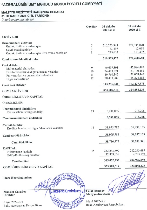 31 Dekabr 2021-ci il tarixində “Azəralüminium” MMC 353 milyon 809 milyon manat cəmi aktivlərə malik olub. Şirkət 2020-ci ilin sonunda 324 milyon 888 min manat cəmi aktivlərə malik idi.