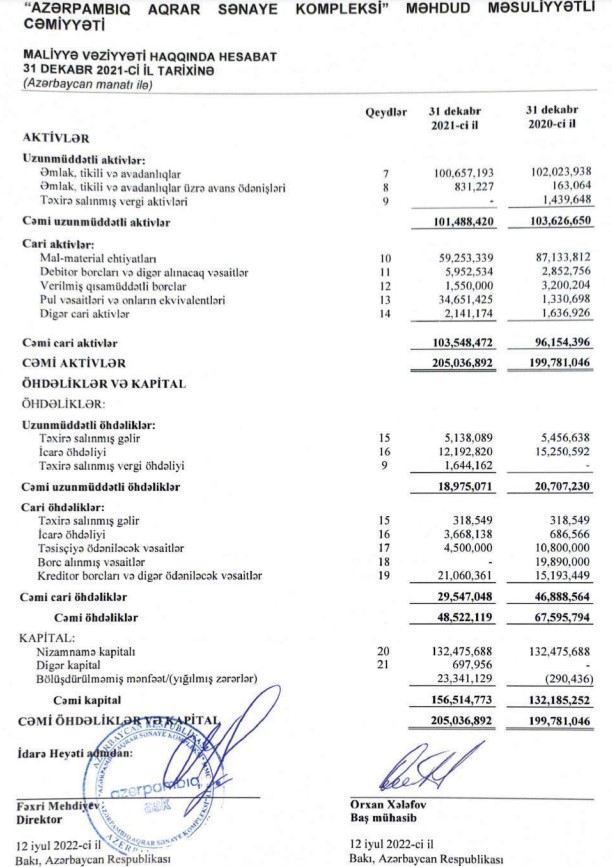 31 Dekabr 2021-ci il tarixində “Azərpambıq Aqrar Sənaye Kompleksi” MMC 205 milyon 37 min manat cəmi aktivlərə malik olub. Şirkət 2020-ci ilin sonunda 199 milyon 781 min manat cəmi aktivlərə malik idi.