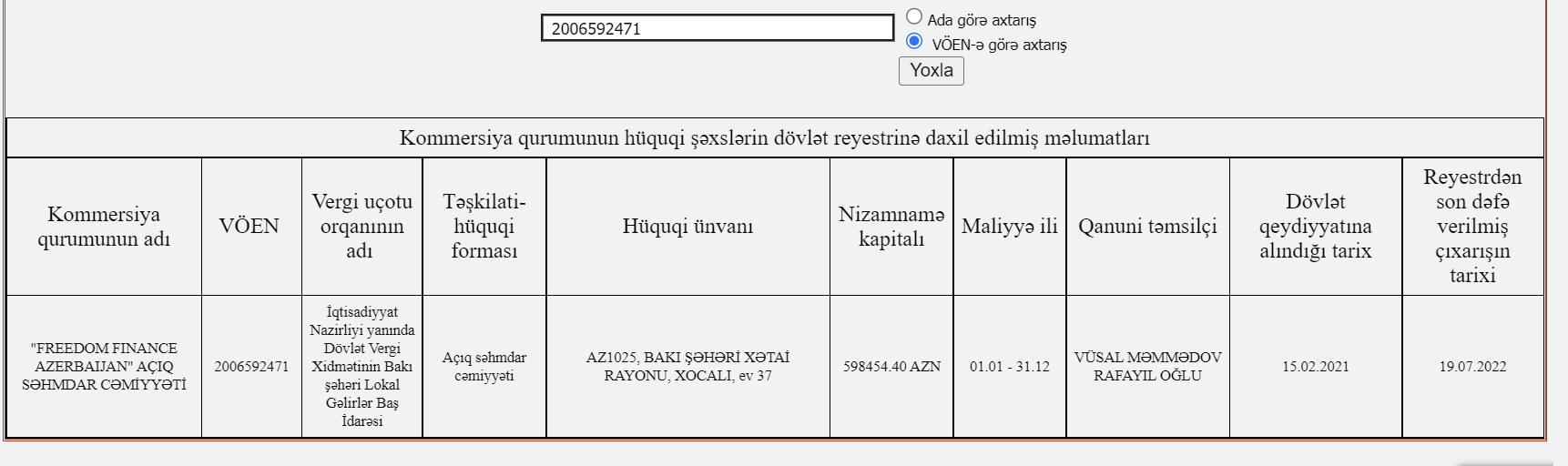 15 Fevral 2021-ci il tarixində dövlət qeydiyyatına alınmış "Freedom Finance Azerbaijan ASC-nin direktoru Məmmədov Vüsal Rafayıl oğludur.