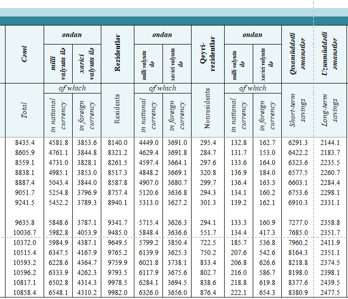 Ötən ilin sonunda, banklarda fiziki şəxslərin banklardakı depozitləri 9 milyard 32.4 milyon manat, o cümlədən müddətli depozitlər 5 milyard 339 milyon manat, tələbli depozitlər 3 milyard 693.4 milyon manat təşkil etmişdi. Sahibkarlıqla məşğul olan fiziki şəxslərin depozitləri isə 209 milyon manat olmuşdu.