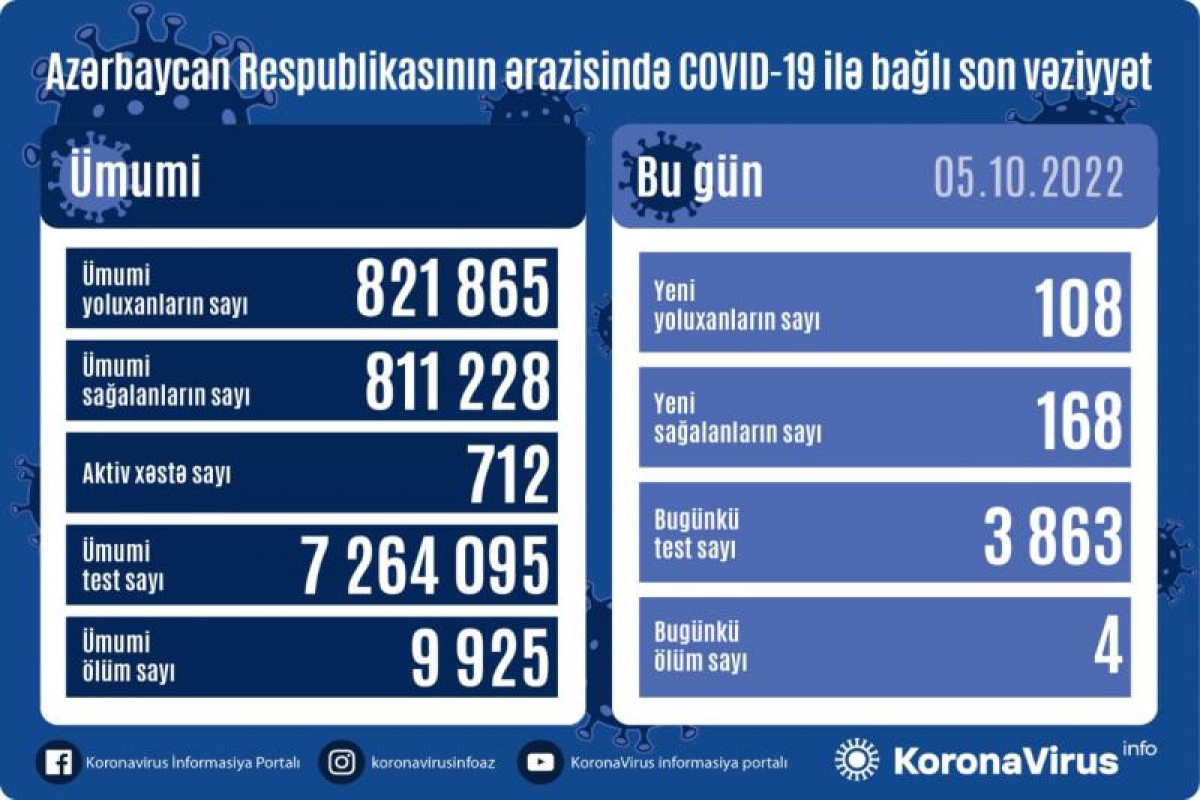 Azərbaycanda koronavirus (COVID-19) infeksiyasına 108 yeni yoluxma faktı qeydə alınıb, 168 nəfər müalicə olunaraq sağalıb.