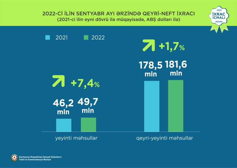 İqtisadi İslahatların Təhlili və Kommunikasiya Mərkəzinin təqdim etdiyi “İxrac icmalı”nın oktyabr sayına görə, 2022-ci ilin yanvar-sentyabr aylarında Azərbaycanın ümumi ixracı 29,5 milyard ABŞ dolları, qeyri-neft sektoru üzrə ixrac 2,1 milyard ABŞ dolları təşkil edib.