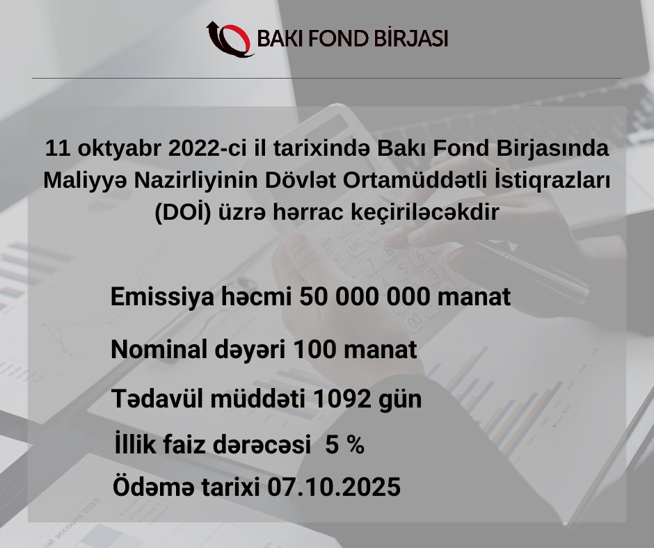 Maliyyə Nazirliyi istiqrazların yerləşdirilməsi yolu ilə 50 milyon manat borc cəlb etməyi nəzərdə tutur.11 oktyabr 2022-ci il tarixində Bakı Fond Birjasında Maliyyə Nazirliyinin 50 milyon manatlıq Dövlət Ortamüddətli İstiqrazları (DOİ) üzrə hərrac keçiriləcəkdir.