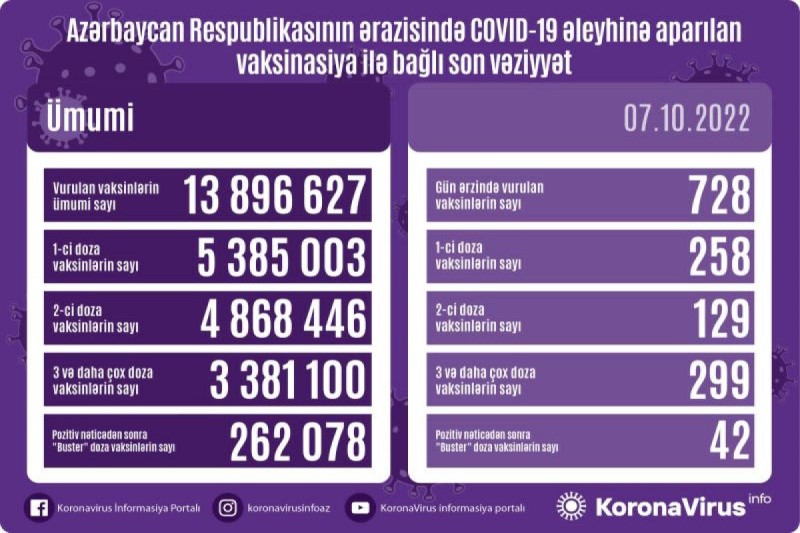 Azərbaycanda son sutkada koronavirus (COVID-19) əleyhinə 728 vaksin vurulub. Bir gündə birinci mərhələ üzrə vaksinasiya olunanların sayı 258, ikinci mərhələ üzrə vaksinasiya olunanların sayı 129, üç və daha çox doza vaksin vurduranların sayı 299, pozitiv nəticədən sonra buster doza üzrə vaksinasiya olunanların sayı isə 42 nəfərdir.