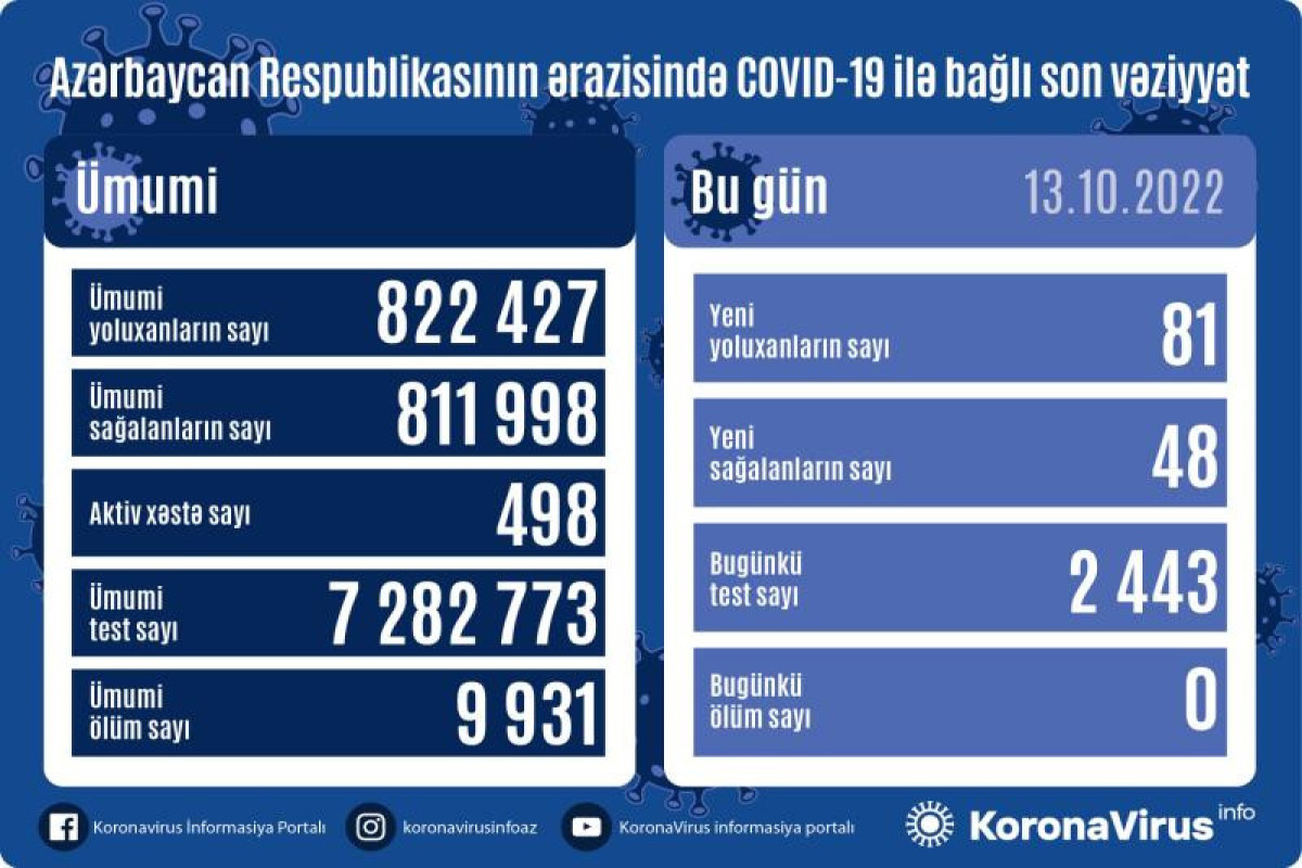Azərbaycan Respublikasında koronavirus (COVID-19) infeksiyasına 81 yeni yoluxma faktı qeydə alınıb, 48 nəfər müalicə olunaraq sağalıb.