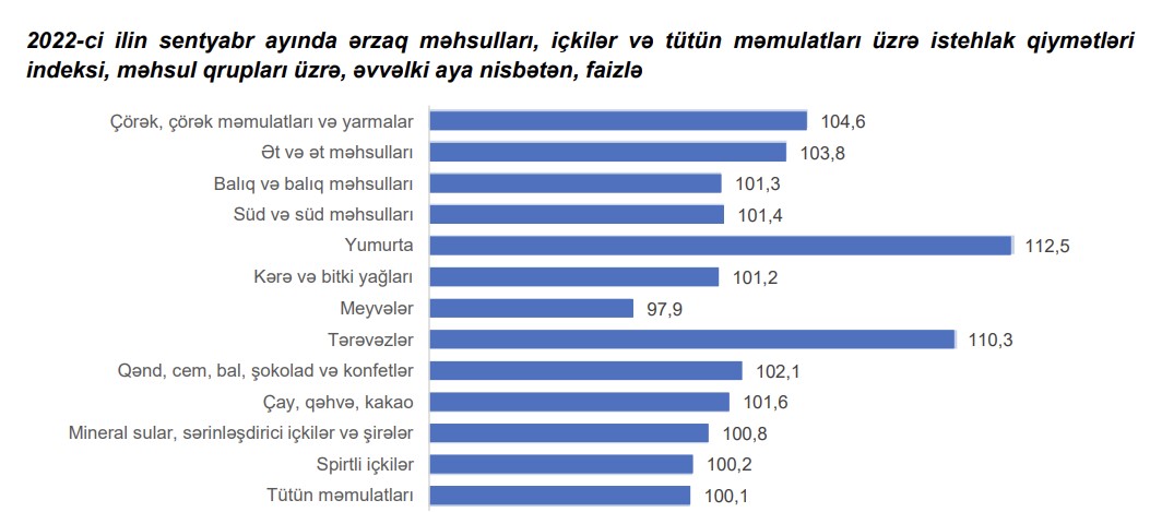 2022-ci ilin sentyabr ayında ərzaq məhsulları, içkilər və tütün məmulatları üzrə istehlak qiymətləri indeksi əvvəlki aya nisbətən 3,4 faiz, əvvəlki ilin sentyabr ayına nisbətən 21,8 faiz artıb.