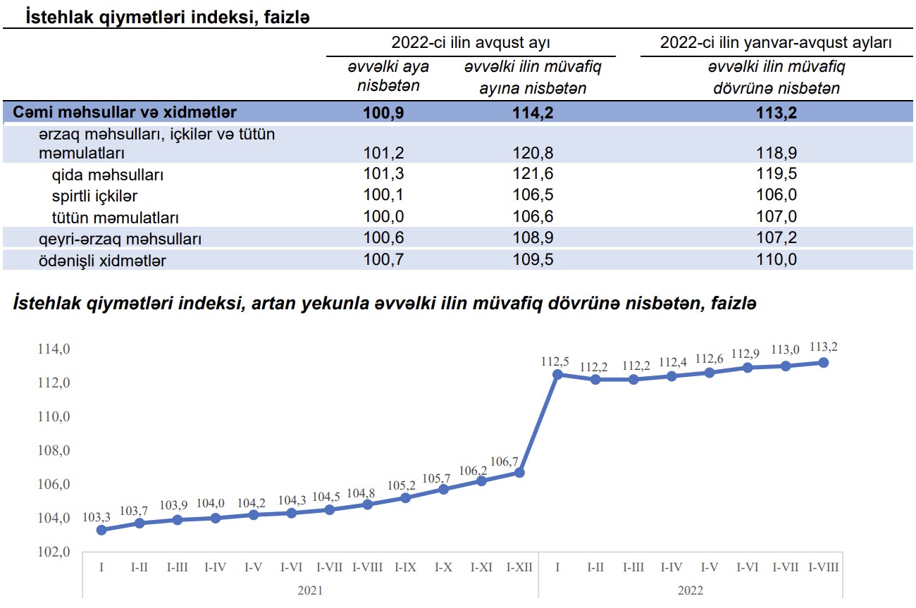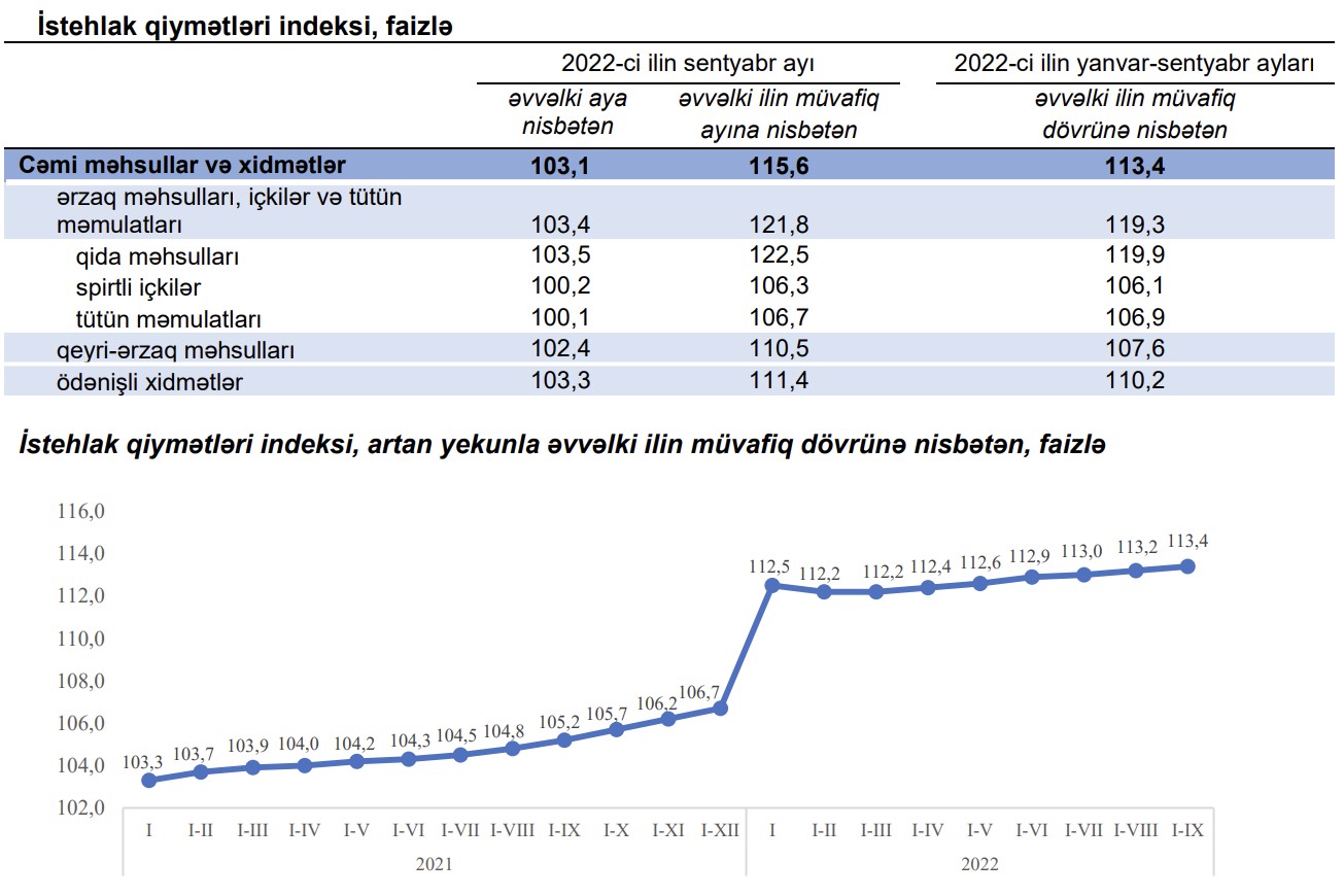 Marja.az-ın Dövlət Statistika Komitəsiə istinadən yaydığı məlumata görə, 2022-ci ilin sentyabr ayında istehlak qiymətləri indeksi (inflyasiya göstəricisi) 2021-ci ilin sentyabr ayına nisbətən 15,6 faiz artıb. Avqustda 12 aylıq inflyasiya 14,2% təşkil etmişdi.