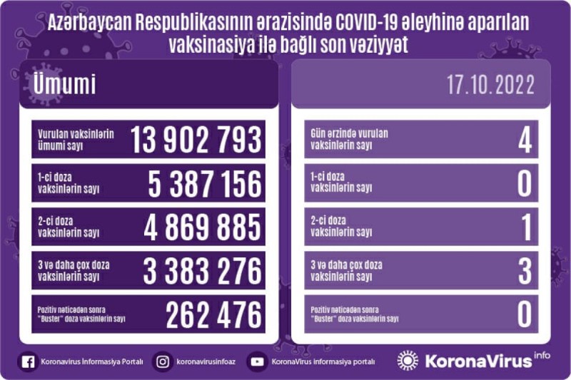 Azərbaycanda son sutkada koronavirus (COVID-19) əleyhinə 4 vaksin vurulub. Bir gündə birinci mərhələ üzrə vaksinasiya vurulmayıb, ikinci mərhələ üzrə vaksinasiya olunan isə 1 nəfər, üç və daha çox doza üzrə vaksinasiya olunanların sayı 3, pozitiv nəticədən sonra buster doza üzrə vaksinasiya olunan isə qeydə alınmayıb.