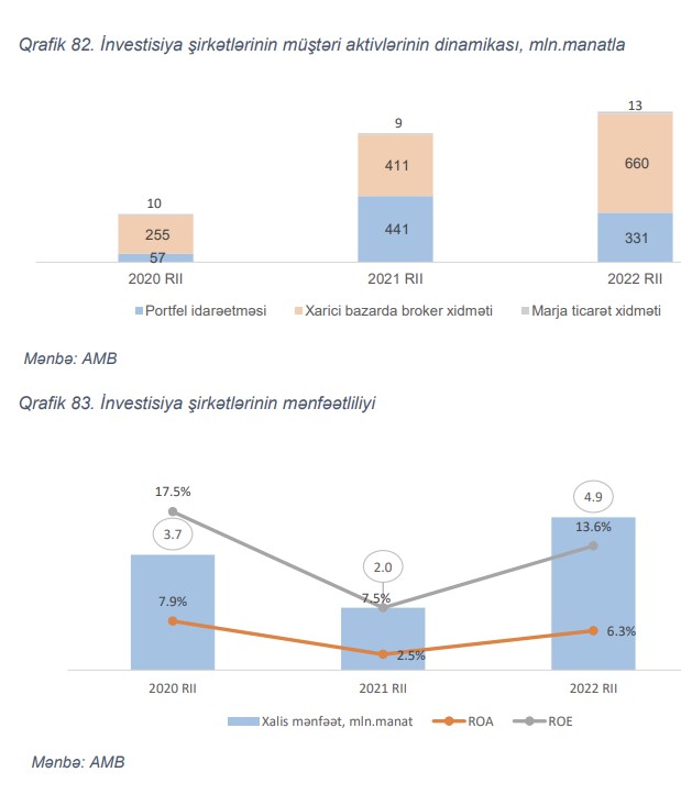 Qeyd edilib ki, 2022-ci ilin ikinci rübündə investisiya şirkətlərinin aktivləri 77.4 milyon manat təşkil etmişdir. Yarımil ərzində bir investisiya şirkətinə investisiya xidmətlərinin göstərilməsi üçün lisenziya verilmiş və investisiya şirkətlərinin sayı 13-ə çatmışdır. Bununla yanaşı, investisiya şirkətlərinin müştəri bazası genişlənmişdir. 2022-ci ilin II yarımilində müştəri aktivləri 17% artaraq 1 milyard manat olmuşdur.