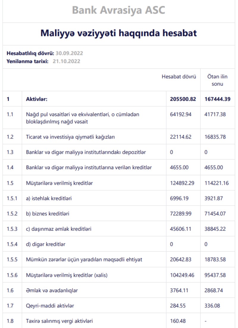 2021-ci ilin sonu ilə müqayisədə 2022-ci ilin 9 ayı ərzində "Bank Avrasiya"nın cəmi aktivləri 38 milyon 56 min manat və ya 22,7% artaraq 205 milyon 500 min manata yüksəlib. Bankın qiymətli kağızlara investisiyalarında da artım baş verib.