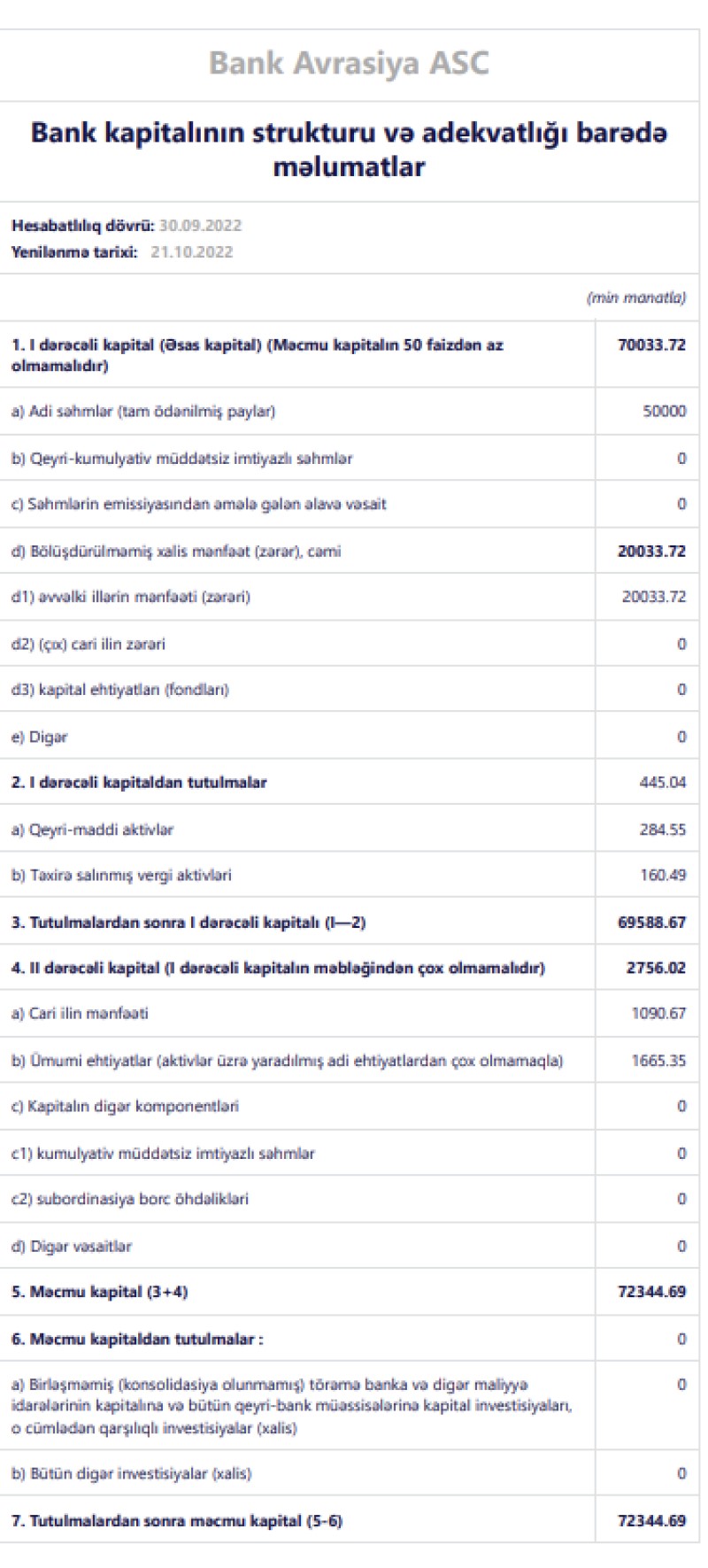 30 Sentyabr 2022-ci il tarixində "Bank Avrasiya" ASC 72 milyon 344 min manat məcmu kapitala malik olub. Bank ötən ilin sonunda 70 milyon 932 min manat məcmu kapitala malik idi.