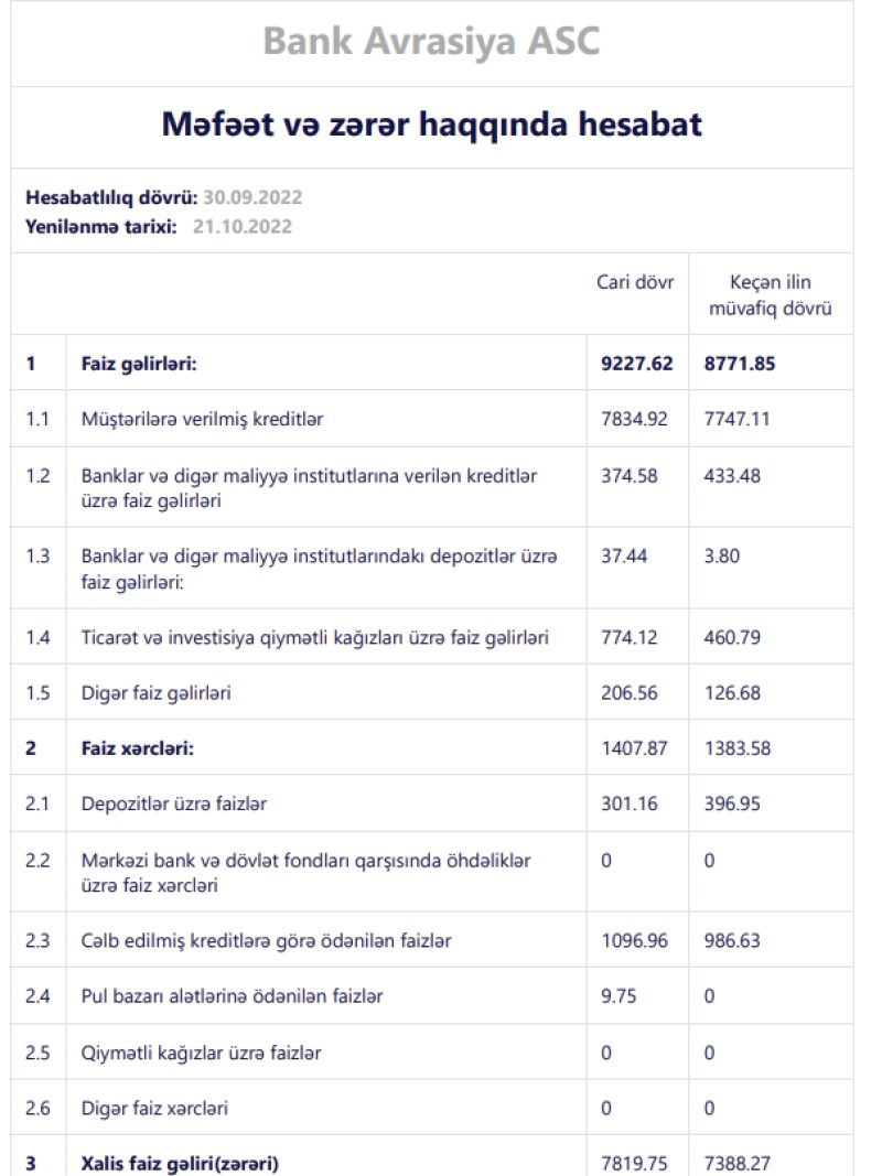 2022-ci ilin 9 ayında "Bank Avrasiya" 5 milyon 42 min manat əməliyyat mənfəətinin 3 milyon 952 min manatını mümkün zərərlər üçün yaradılan məqsədli ehtiyatlara ayırıb. Nəticədə Bank 9 ayı 1 milyon 91 min manat xalis mənfəət ilə bağlayıb. Ötən ilin 9 ayında "Bank Avrasiya" 4 milyon 849 min manat əməliyyat mənfəətinə qarşı mümkün zərərlər üçün yaradılan məqsədli ehtiyata 7 milyon 647 min manat ayırdığı üçün həmin dövrü 2 milyon 798 min manat xalis zərər ilə bağlamışdı.