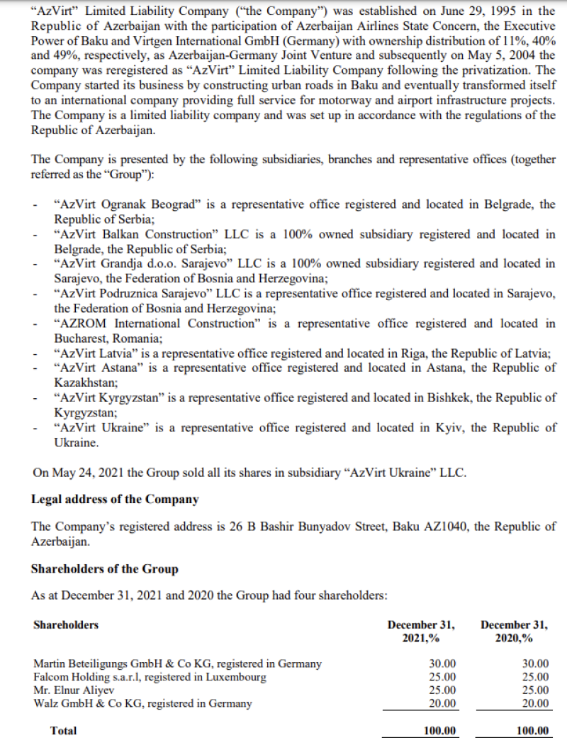 "Azvirt" MMC-nin təsisçiləri "Martin Beteiligungs GmbH & Co KG", Almaniya (30%), "Falcom Holding s.a.r.l", Lüksemburq (25%), Elnur Əliyev (25%) və "Walz GmbH & Co KG", Almaniya (20%).